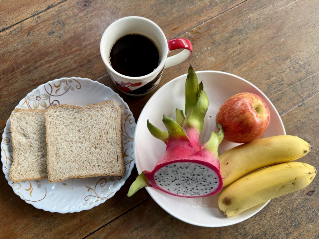 เช้านี้ผมตื่นสายเล็กน้อย ดีที่เจ้าหลงร้องเรียกปลุก ผมจึงลุกขึ้นมาเทอาหารให้หมาแมว แล้วชงกาแฟมานั่งดื่มเงียบๆ โดยมีขนมปังโฮลวีทและผลไม้ที่กินเป็นอาหารเช้า