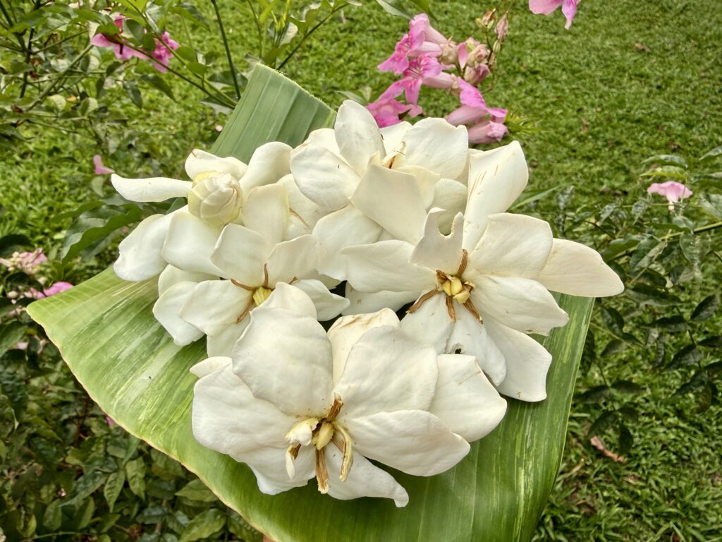 จากนั้นจึงเปิดประตูสวนให้หมาแมวไปวิ่งเล่น ส่วนผมเดินไปเก็บดอกพุดซ้อนที่ส่งกลิ่นหอมละมุน กลิ่นหอมนั้นยากจะหักห้ามใจ ผมจึงเก็บดอกพุดซ้อนแล้วนำไปวางในห้องนอน